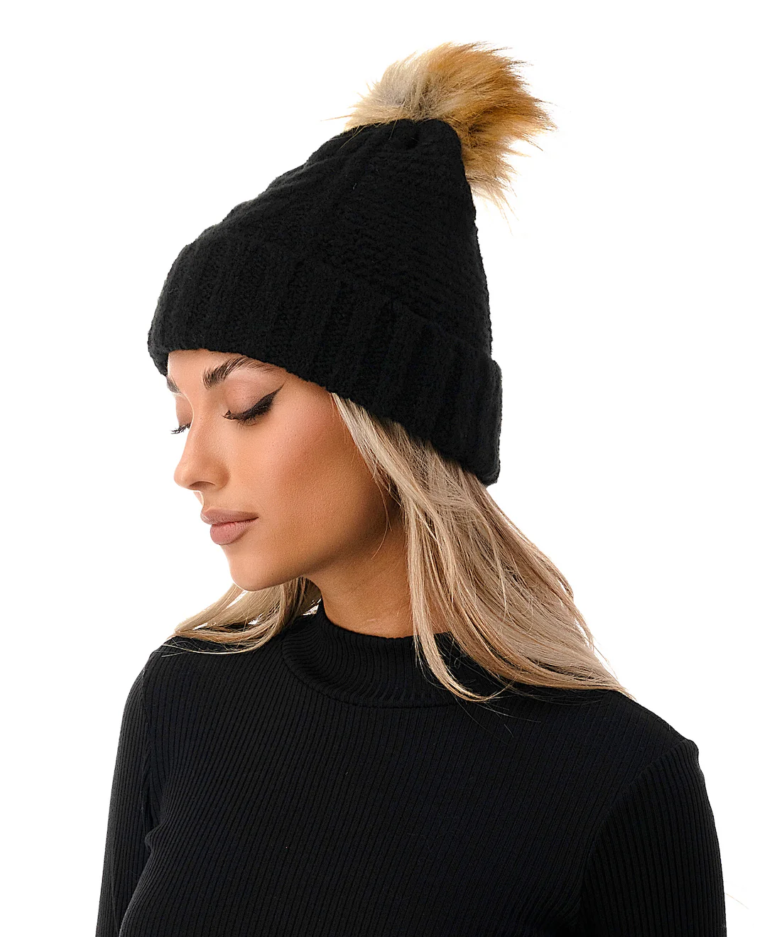 This cable knit beanie with faux fur pom will complete any outfit this winter.