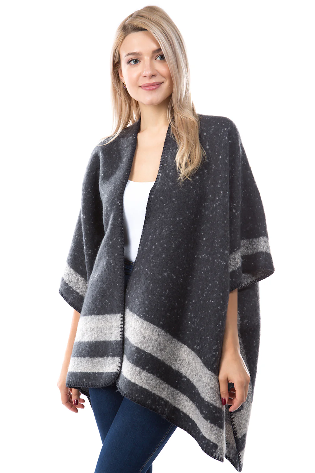 The Casey Ruana is our classic ruana with a striped border and beautiful whipstitch detail.