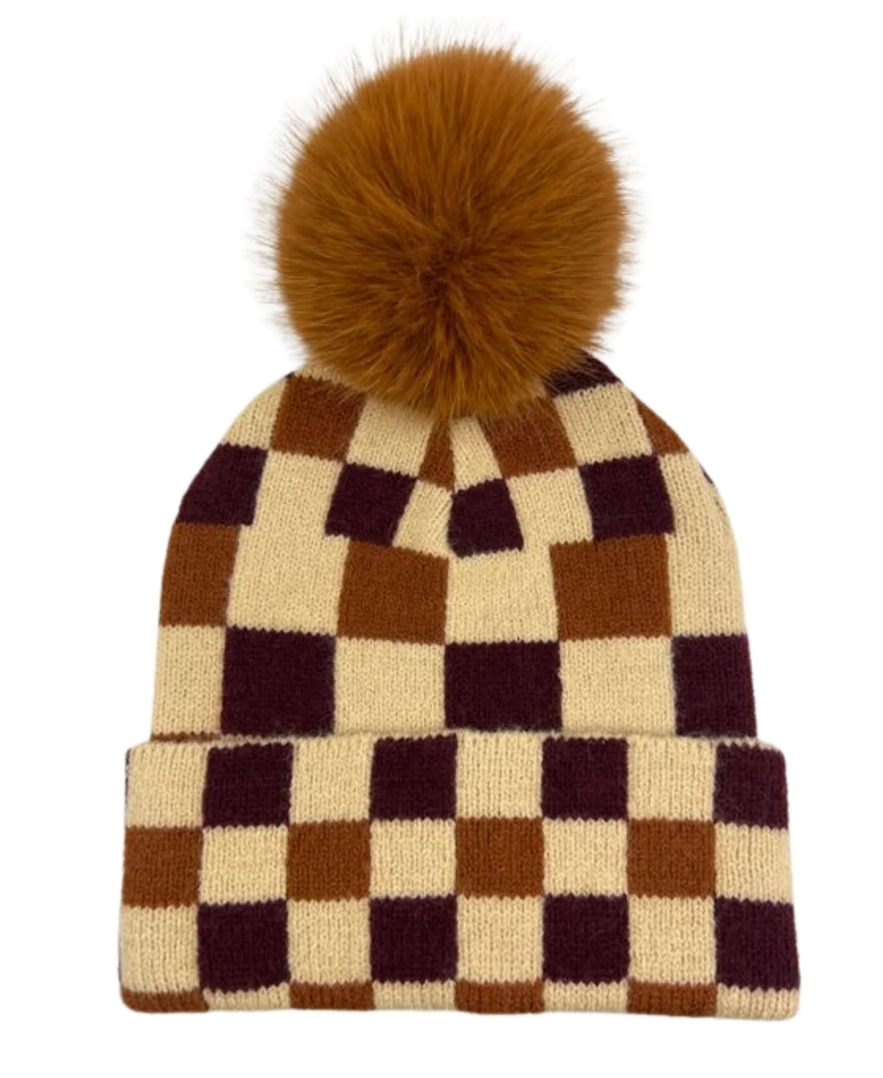 Stay on trend with our knit checkered beanie with faux fur pom.